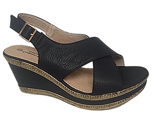 Best Seller! Ladies A05 Cushion Walk Wide E Fit Leather Lined Wedge Peep Toe Strappy Summer Sandal Size 3-8 (UK 7, Black) Review